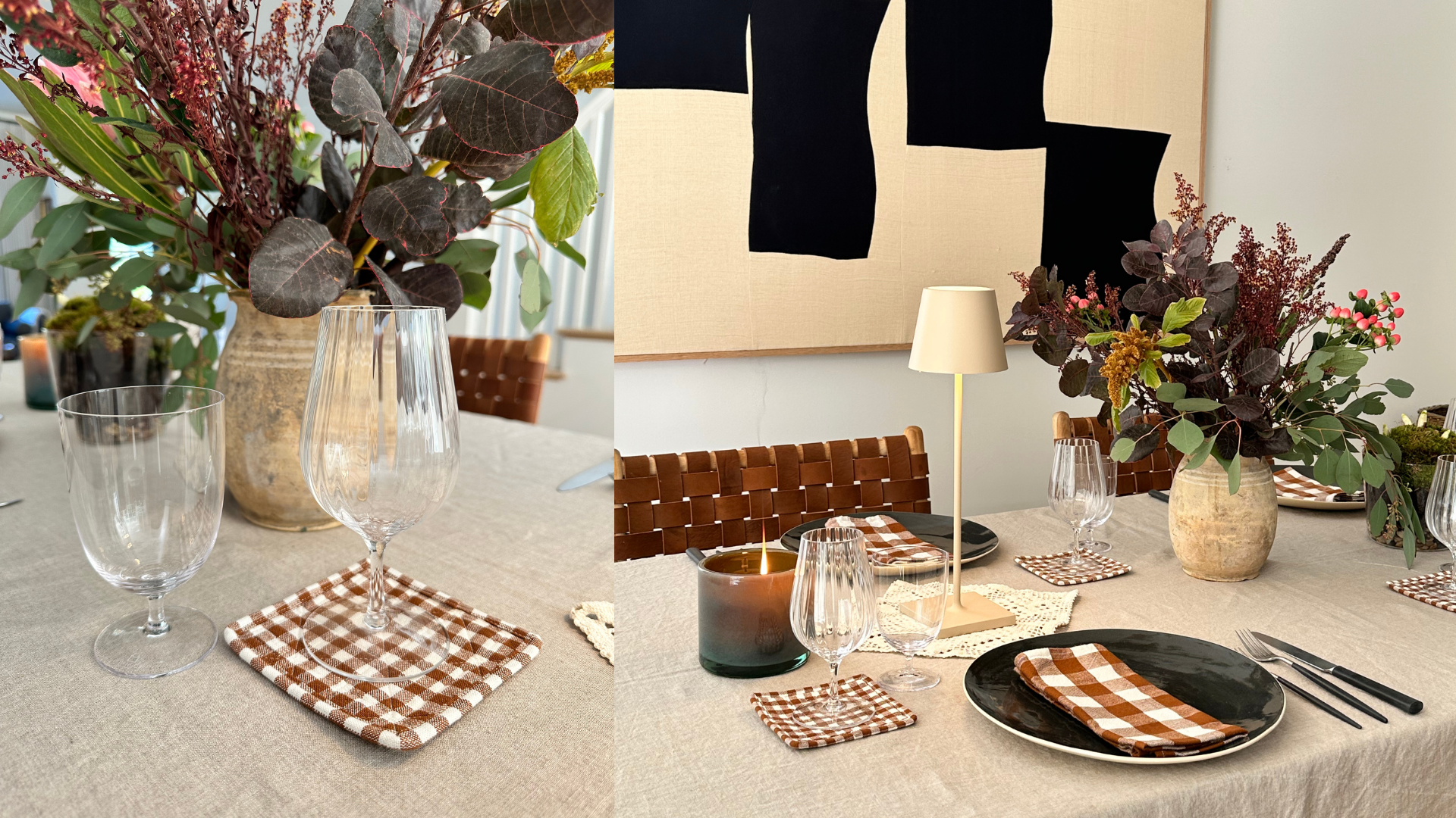 I wanted to create two very different scapes. The first is warm and moody. I love the dark elements and how the Heather Taylor Home plaid napkins and coasters match my leather chairs from Saffron and Poe. The linen tablecloth is from Jenni Kayne and the Brickett Davda black plates, which are handmade in the UK, are from March in San Francisco and are just divine.