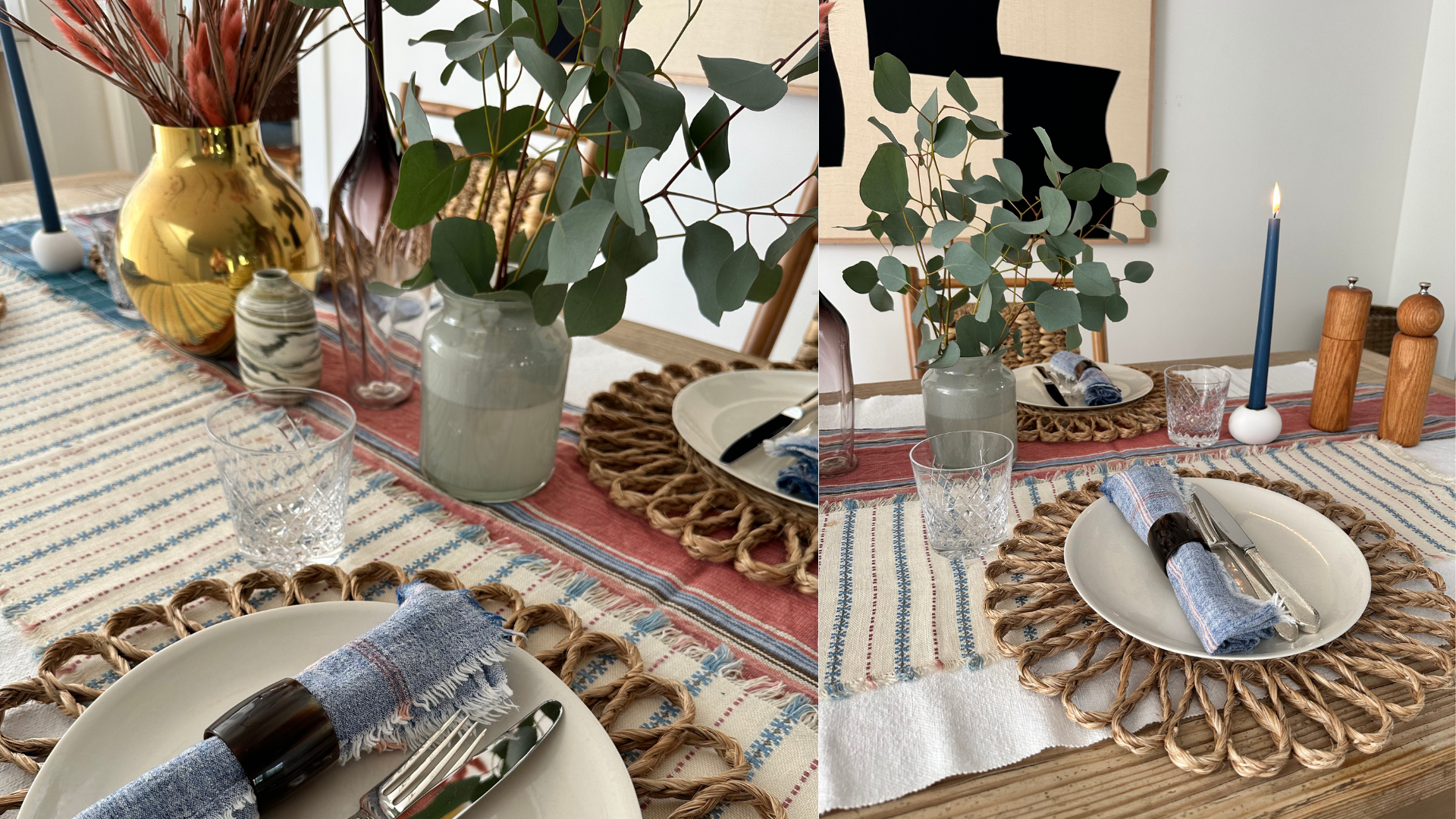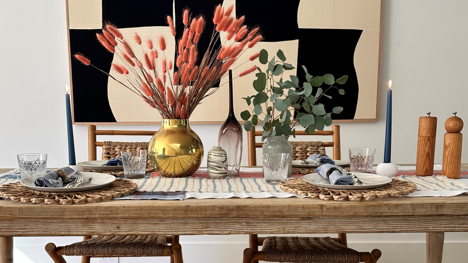 This table inspo uses a neutral, soft pink and blue color palette and features lots of layers. I used boho-vibe rattan place mats from Serena and Lily and neutral-colored plates from Mud Australia to make the napkins and silverware (which I received as a wedding gift!) pop. I wanted the floral arrangement to be different to the classic rustic setting, so I used these beautiful silky-soft coral-colored bunny tails and a simple eucalyptus arrangement to compliment the small swirl-design vase from Lawson Fenning, all bringing a fresh element to the table setting.