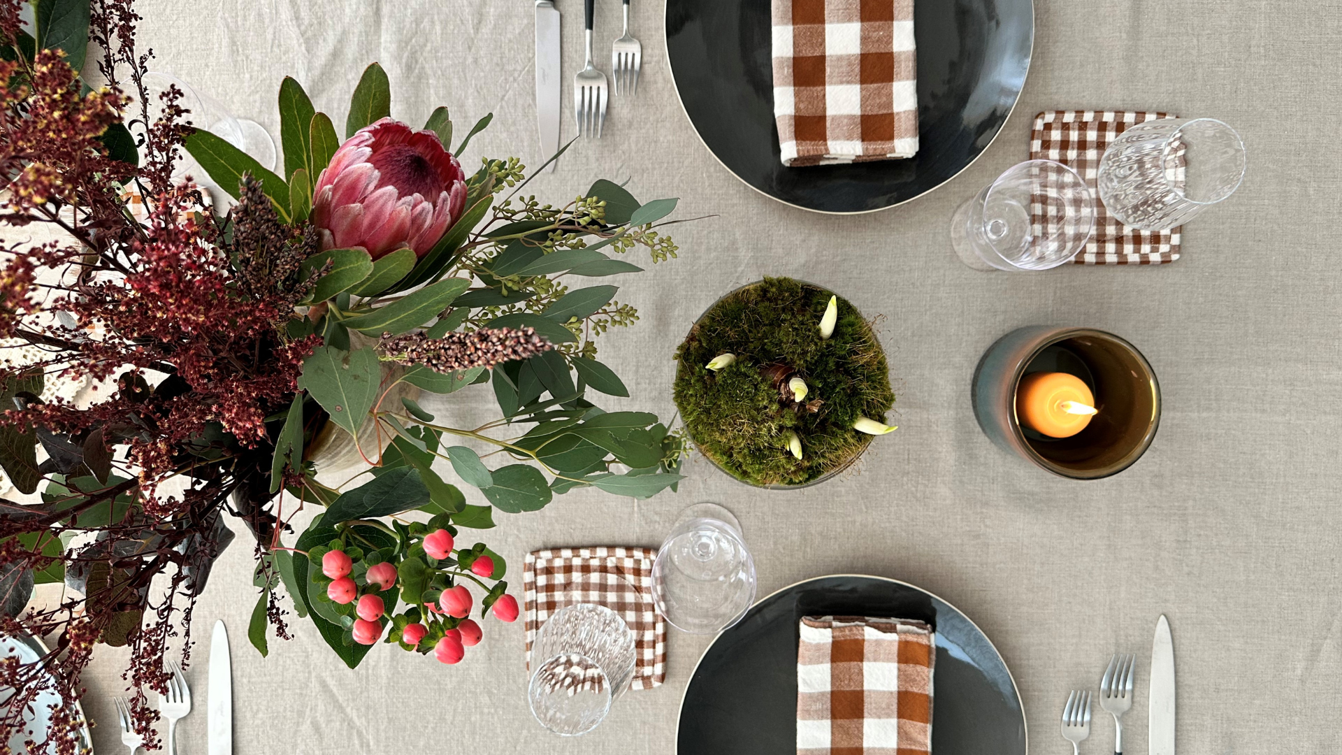For me, a table setting isn’t complete unless there’s a variety of flower arrangements. For this classic rustic vibe, I couldn't go past a beautiful tall purple protea arrangement and paired this with a young paperwhite bulb and moss combination, which I just love.