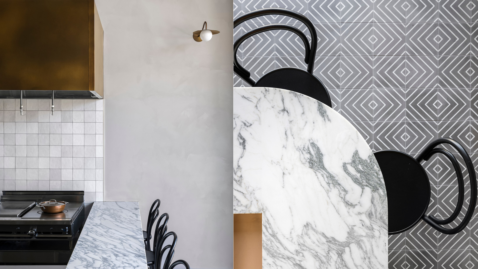 On the walls, we used a beautiful lime wash paint from JH Wall paints, to achieve a velvety, venetian plaster-look. For the wall tiles, I intentionally wanted to use a classic, 4x4 ceramic tile to deliver that quintessential bistro feeling and an understated monotone variation to compliment the lime wash paint. On the floor we chose a more modern, lux, patterned tile from Cle tile - which provides a subtle contrast to the classic bistro elements in the space.